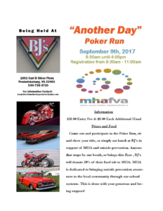 Come out to BJ’s in Central Park, 1861 Carl D Silver Pkwy, and participate in the Poker Run, sit and show your ride, or simply eat lunch at BJ’s in support of MHA and suicide prevention. For anyone who stops by our booth, or brings the flyer shown here, BJ’s will donate 20% of their food tab to MHAF. MHAF is dedicated to bringing suicide prevention awareness to the local community through our school systems. THis is done with your generous and loving support.