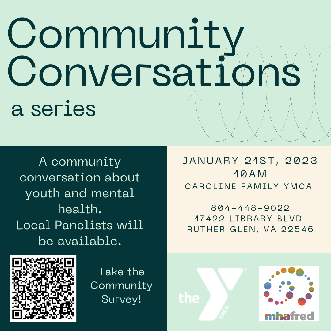 Community Conversations Series January 21, 2023 @ 10:00 AM - 12:00 PM Caroline Family YMCA 17422 Library Blvd., Ruther Glen, VA, United States A community conversation about youth and mental health with local panelists!